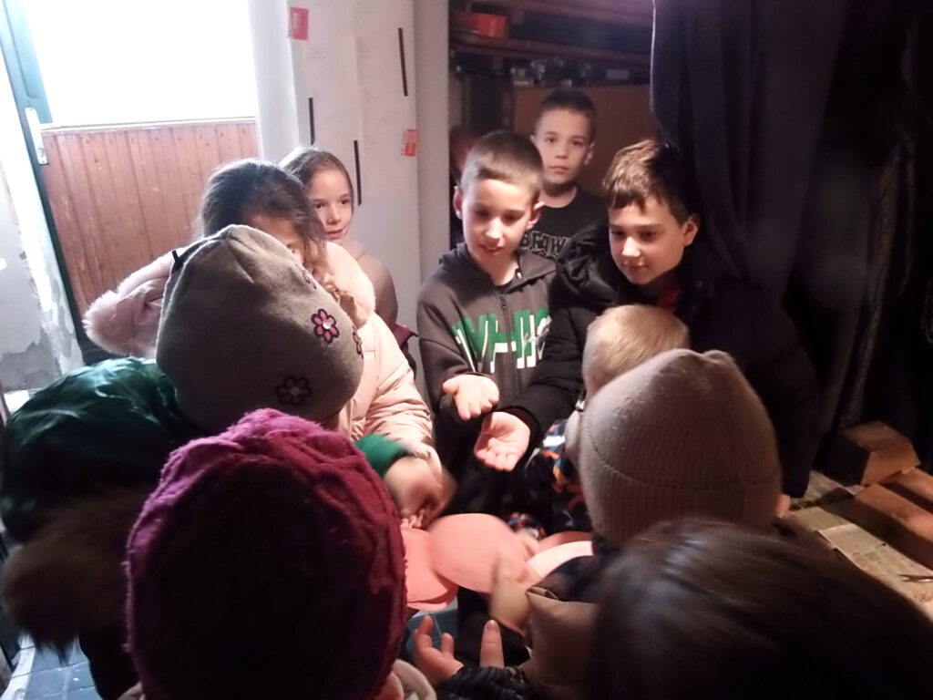 Dostali sme poctivé pozvanie od starých rodičov Réky Hugyecsekovej. Mohli sme nahliadnuť do vianočných príprav a spoznať všetky tajomstvá pečenia oblátok. Ujo Béla začína piecť vianočné oblátky už začiatkom novembra. Prezradil nám zloženie cesta, spôsob prípravy a ukázal nám svoje nástroje. Už po niekoľko generácií je tradíciou, že rodina Hugyecsekovcov pripravuje tieto oblátky, ktoré nesmú chýbať na slávnostnom stole mlynských rodín. Tento rok ich pripravil až 2400 kusov. Odvážnejšie deti si dokonca mohli vyskúšať zdvihnúť horúce, ťažké, viac ako 100-ročné železné kliešte na oblátky. Teta Ancsa nám porozprávala o vianočných stravovacích zvykoch ich rodiny a odpovedala na naše otázky. Na záver našej návštevy sme ochutnali čerstvo upečené oblátky. Ďakujeme veľmi pekne Rékiným starým rodičom za pozvanie!