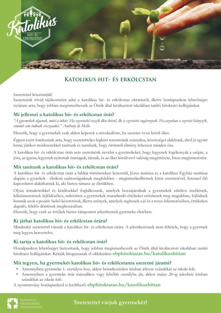 A katolikus hittannal kapcsolatosan az érdeklődőket Rovnyainé Remsei Anikó, illetve Gyimóthyné dr. Ádám Éva tájékoztatja.