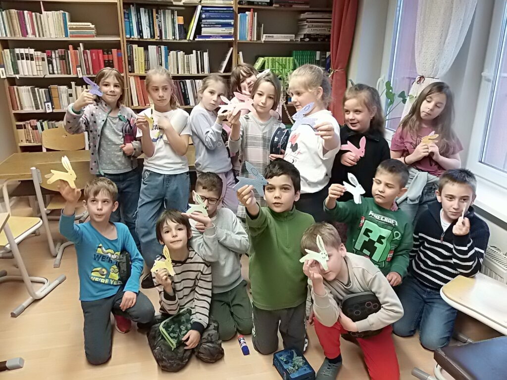 Pred prázdninami sa žiaci prvého a druhého ročníka zúčastnili knižničného podujatia. Z knihy Okrúhly strom života od Márie Bajzáth sme sa oboznámili s udalosťami Veľkého týždňa, ako aj s legendou o červenom vajíčku a veľkonočnom oblievaní. Rozprávali sme sa o mlynských veľkonočných zvykoch. Deti si mohli vyskúšať rapkáč, ktorou oznamovali obyvateľom dediny začiatok omší. Prváci vyrábali z papiera baránka, druháci zajačika.