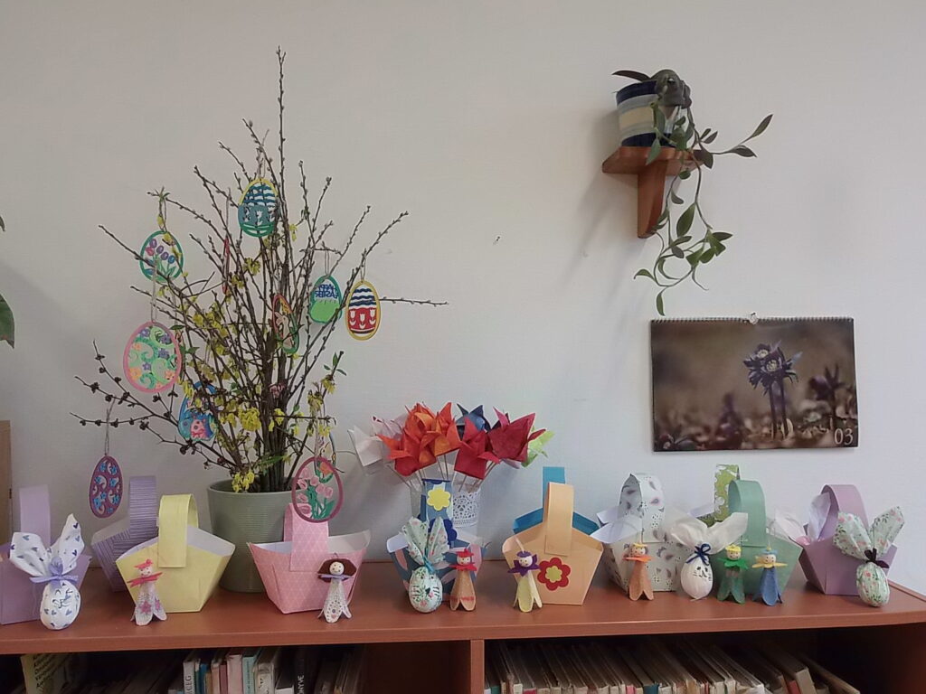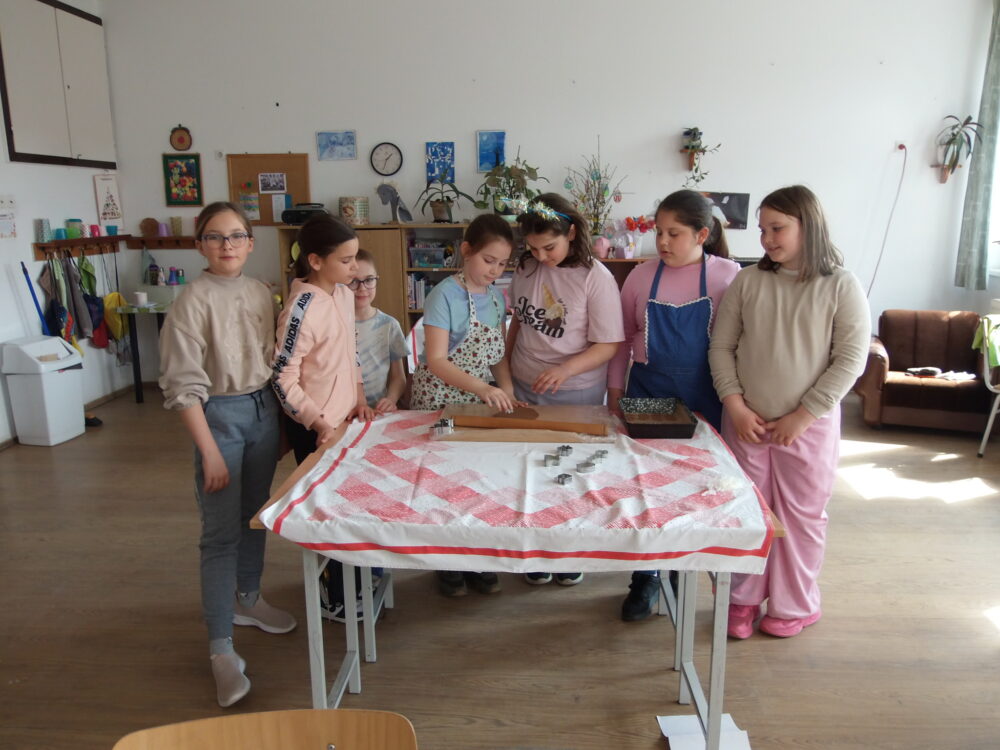 A negyedik osztályosokkal néhány hete kézműves foglalkozásokon készülünk a húsvéti ünnepekre. Újrahasznosított és természetes anyagokból díszeket, apró ajándékokat készítettünk. Berzseléses és maratásos technikával tojásokat festettünk. A szünet előtti napon húsvéti formákkal szaggatott, illatos mézeskalácsot sütöttünk és a helyi szokásokról beszélgettünk.