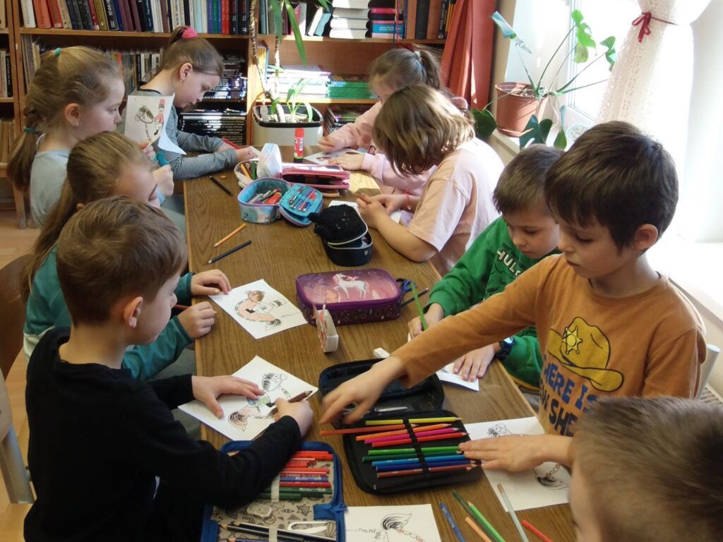 Nadšení žiaci druhého ročníka sa opäť zúčastnili knižničného zamestnania. Z recyklovanej škatule a z vyfarbeného obrázka sme vyrobili cválajúceho husára, pričom sme počúvali piesne z roku 1848. Na konci stretnutia sme sa na povzbudzujúce melódie aj roztancovali.